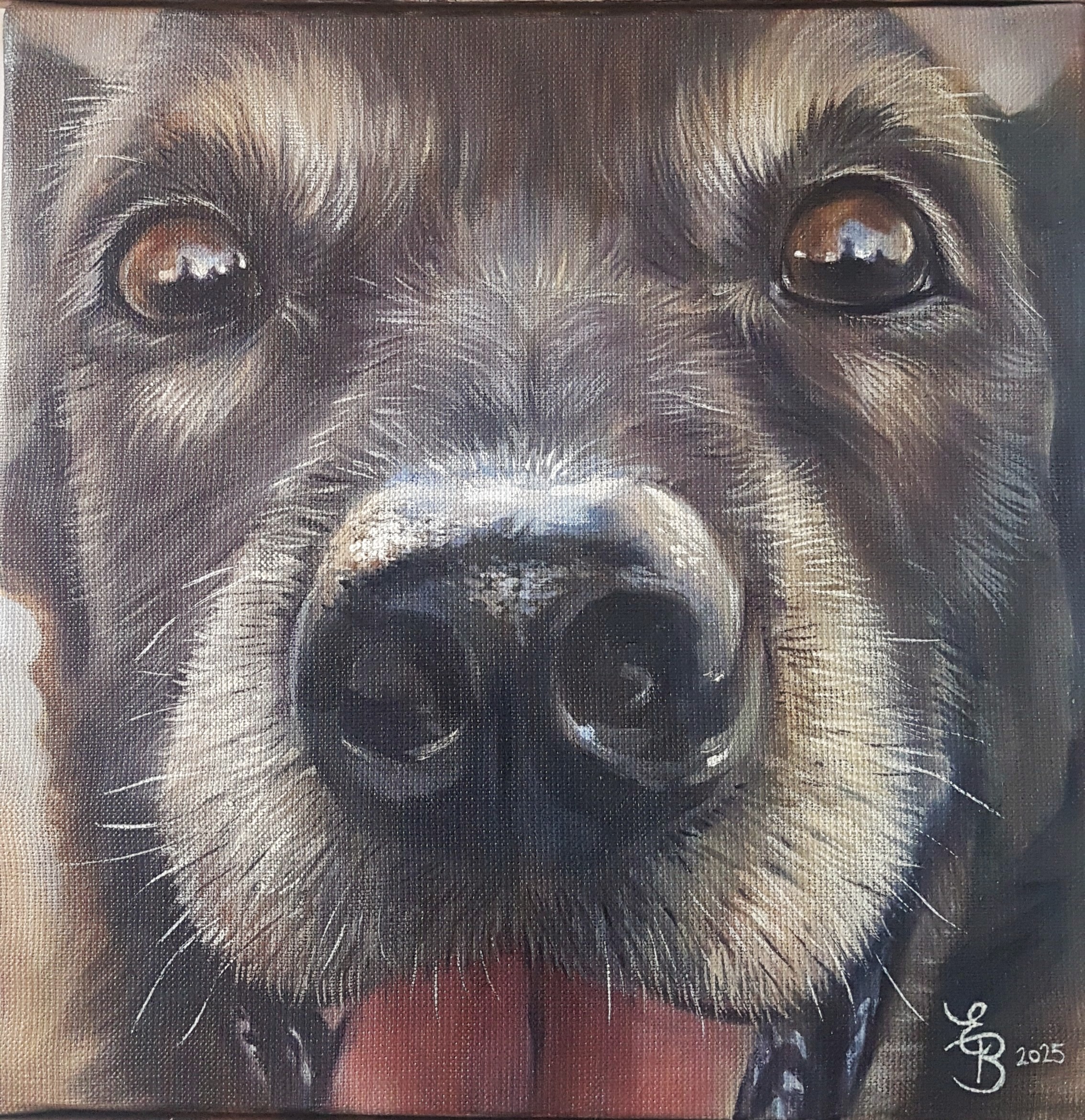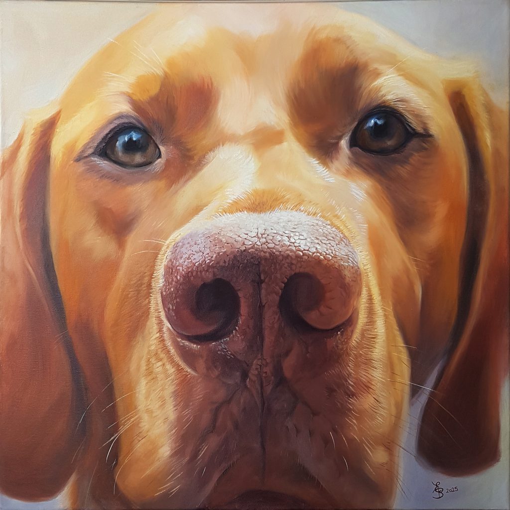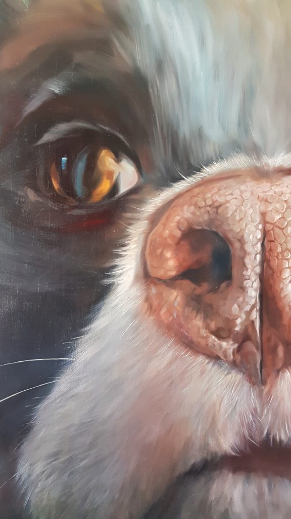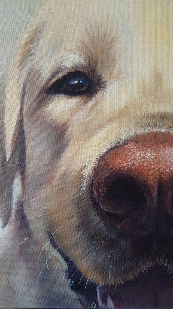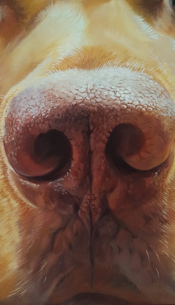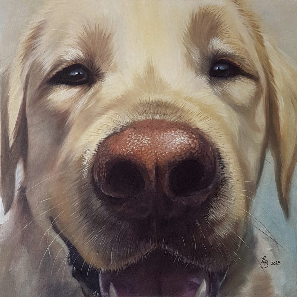 Pour les Truffes je travaille habituellement sur des formats carrés. Je déconseille les toiles de moins de 50×50 cm, en dessous de quoi on perd l’effet de proximité et d’intimité avec notre boule de poils préférée…
