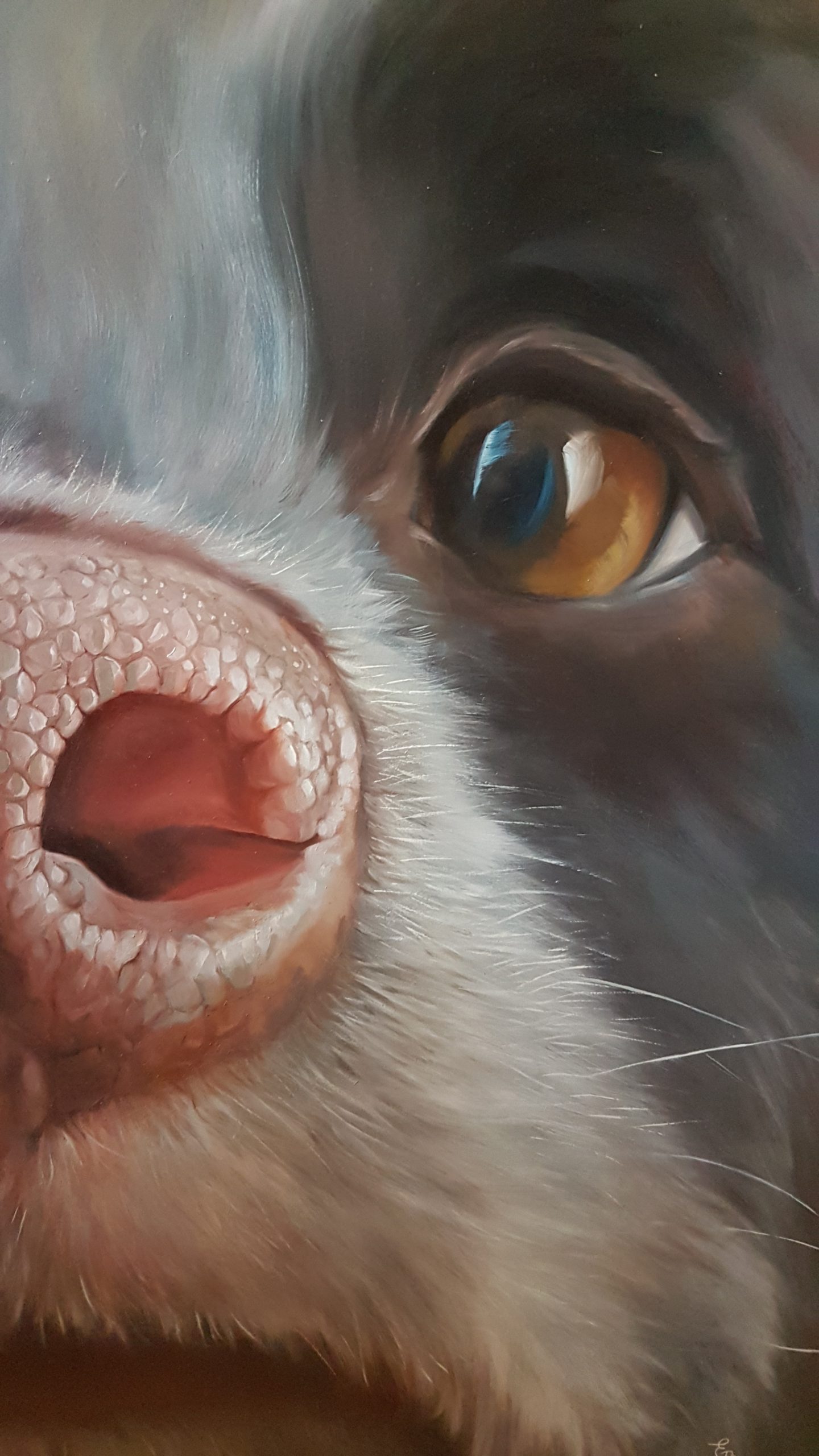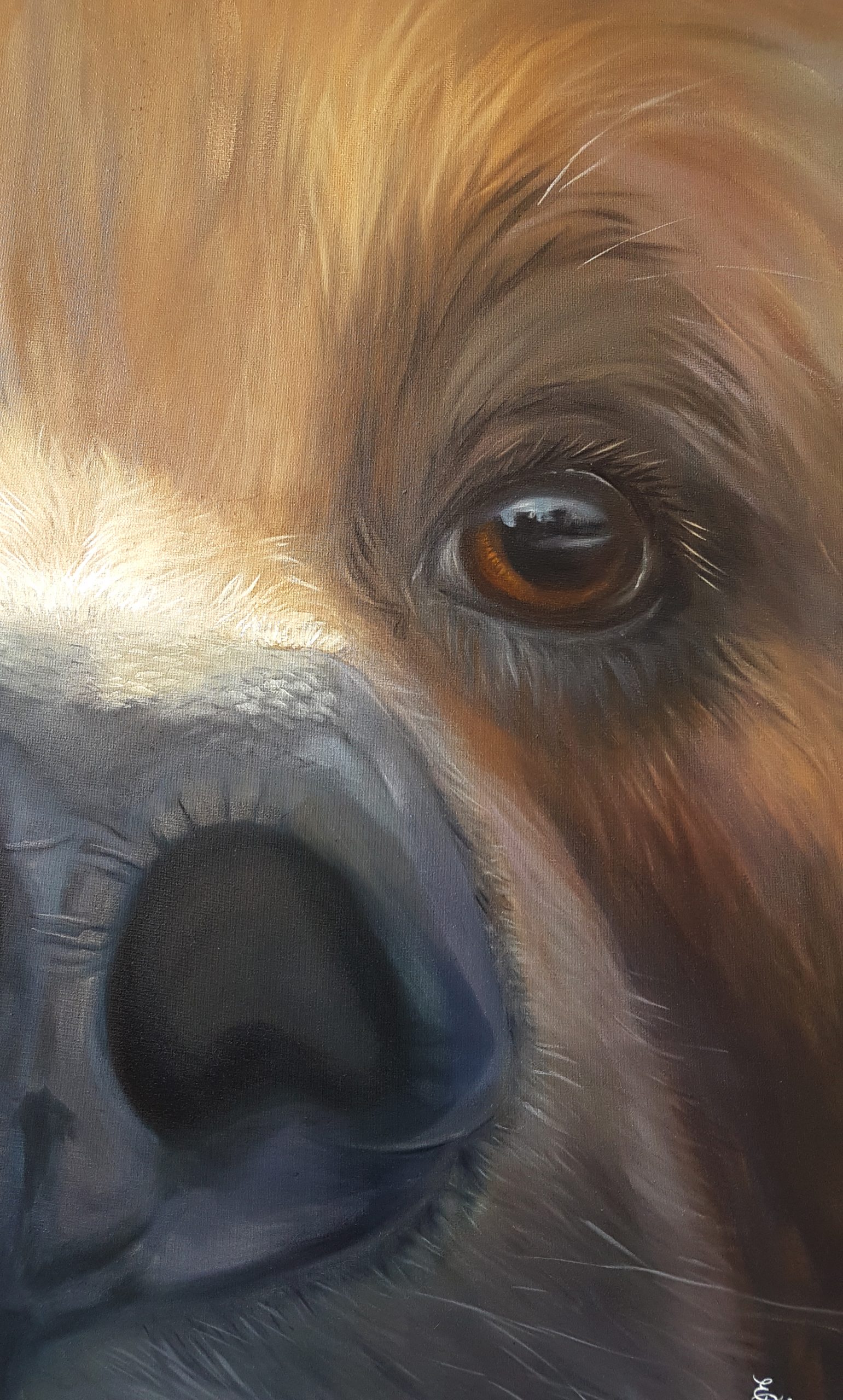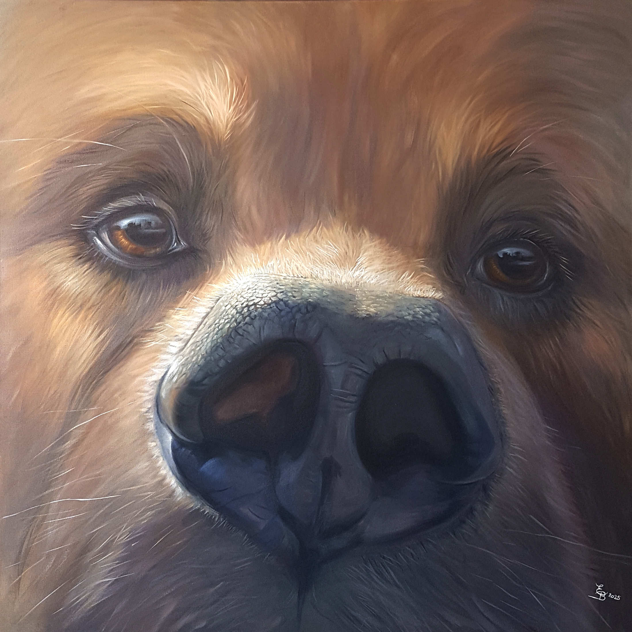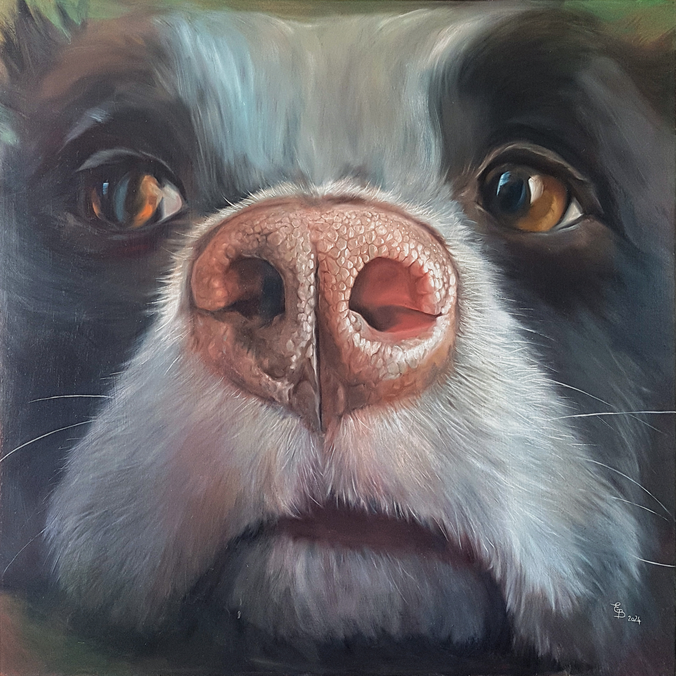 Pour les Truffes je travaille habituellement sur des formats carrés. Je déconseille les toiles de moins de 50×50 cm, en dessous de quoi on perd l’effet de proximité et d’intimité avec notre boule de poils préférée…